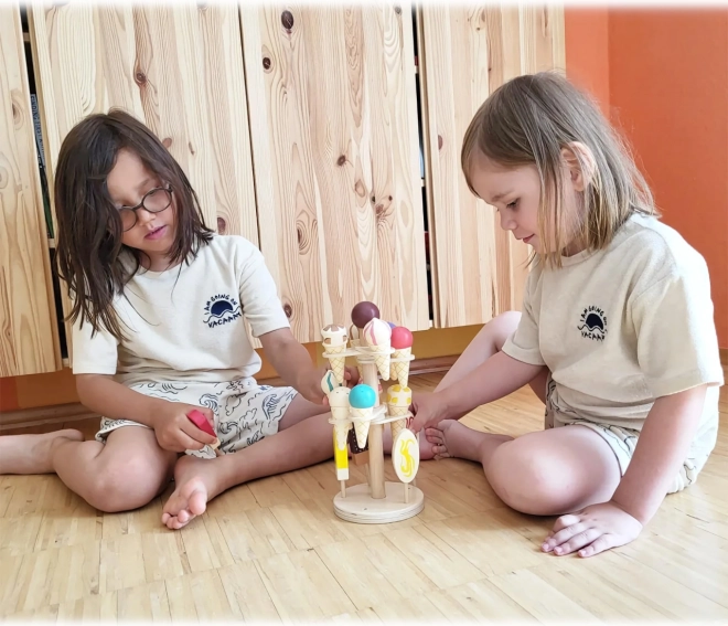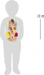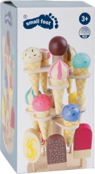 Drewniany stragan z lodami Small Foot zachęca dzieci do kreatywnej zabawy, a jednocześnie pomaga rozwijać umiejętności poznawcze i komunikacyjne. Ten kolorowy zestaw zawiera trzy poziomy z dziesięcioma gałkami lodów i pięcioma lodami na patyku, które można umieszczać w okrągłych otworach lub osadzić w podstawie stojaka.