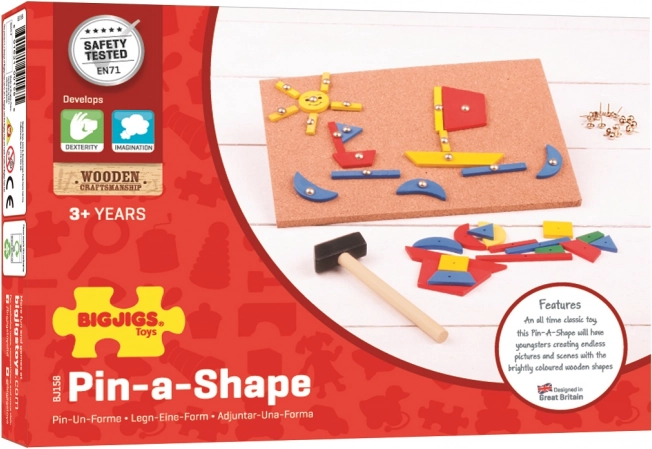 Kreatywny zestaw do wbijania od Bigjigs Toys łączy nieskończoną zabawę i naukę. Dzieci mogą za pomocą drewnianych kształtów, młotka i pinezek tworzyć własne budowlane sceny na korkowej tablicy. Zestaw rozwija małą motorykę, koordynację oko–ręka oraz koncentrację i spełnia europejskie normy bezpieczeństwa.