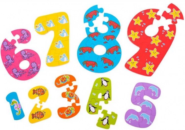 Ten zestaw edukacyjnych puzzli uczy dzieci rozpoznawać cyfry i przyporządkowywać im ilość. Każda liczba składa się z odpowiadającej jej liczby elementów (np. liczba 4 ma cztery elementy) z wesołym zwierzęcym motywem, co wspiera naturalną naukę i radość z układania.