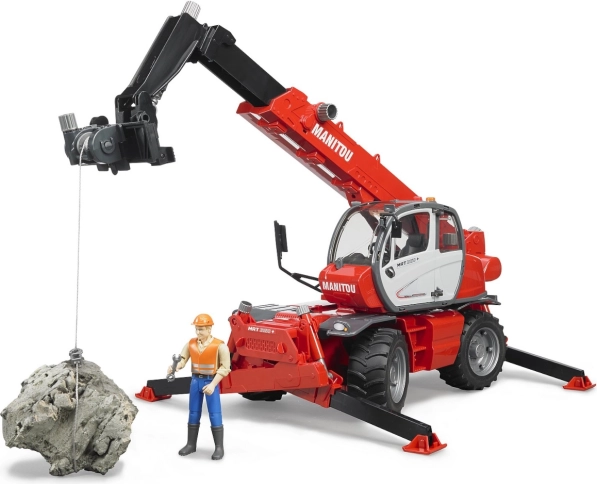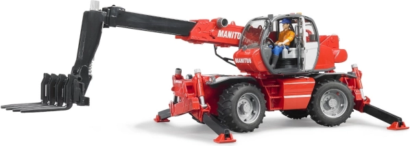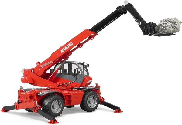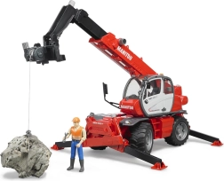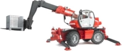 Szczegółowo wykonany model teleskopowego ładowacza MANITOU MRT 2150 marki Bruder ucieszy małych budowniczych i kolekcjonerów. Oferuje obracaną kabinę 360°, czterokołowe skręcanie dla małego promienia zawracania oraz wymienne osprzęty (łyżka, widły, kosz paletowy). Stabilność zapewniają cztery teleskopowe podpory. Wysoka jakość wykonania z wytrzymałego plastiku, wyprodukowano w Niemczech.