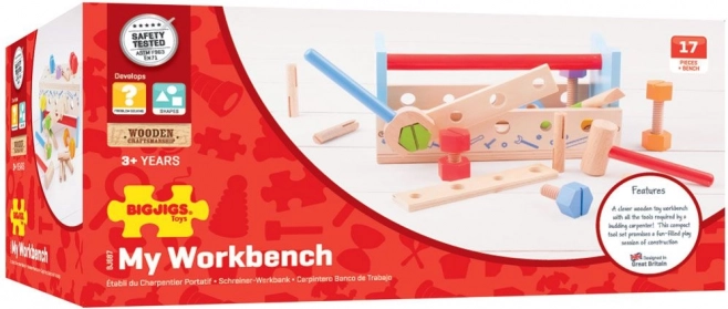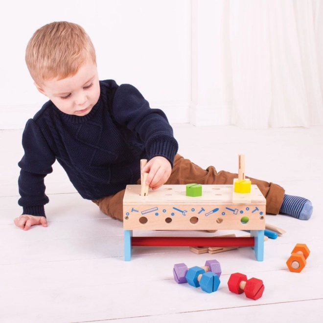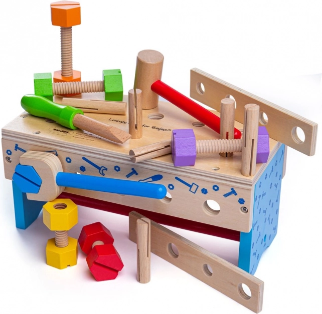 Zabawka Bigjigs Toys oferuje wysokiej jakości drewniany stolik warsztatowy z narzędziami, który w sposób zabawny wspiera rozwój kreatywności i umiejętności motorycznych u dzieci. Zawiera młotek, klucz i różne śruby, które dzieci mogą łatwo wykorzystywać do różnych aktywności konstrukcyjnych.