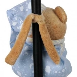 Miś ma niebieską piżamkę z wzorem gwiazdek i księżyca, który działa kojąco i jest idealnym towarzyszem do dziecięcego pokoju.