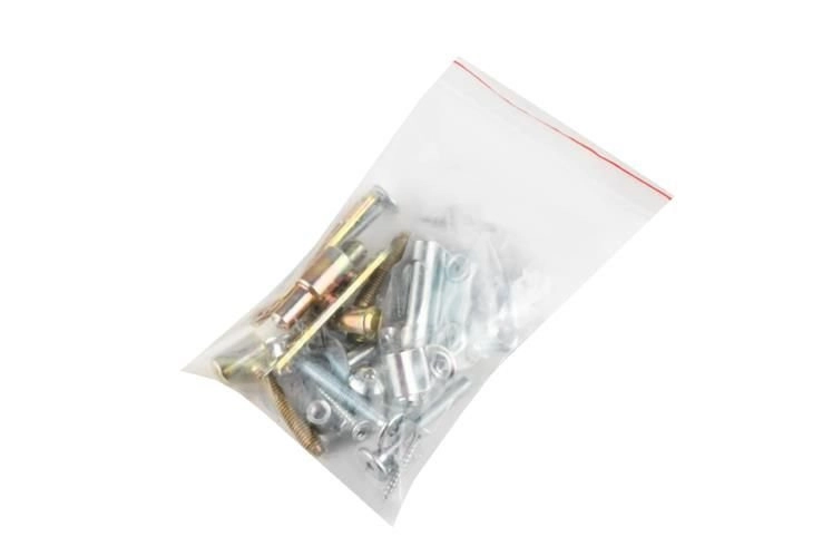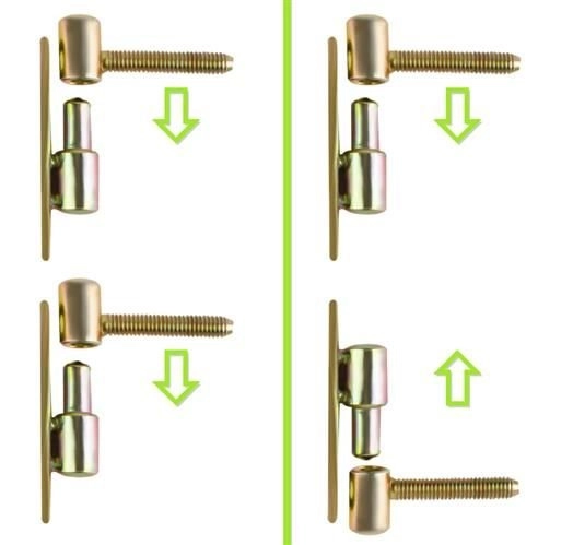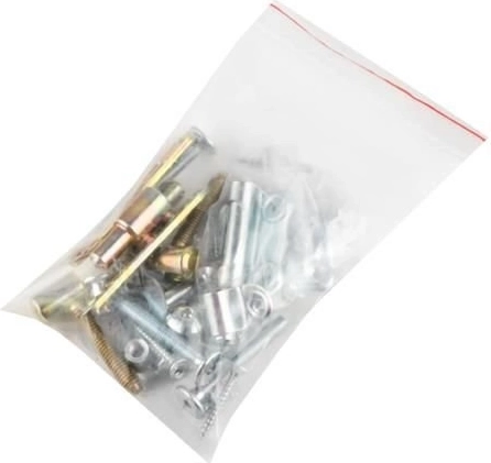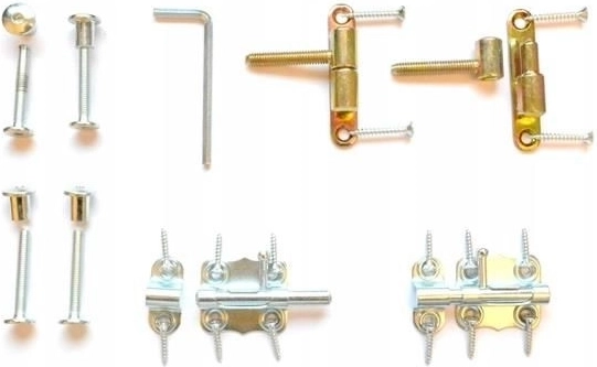- 1× bramka, 2× zawiasy trzpieniowe, 12× małe wkręty, 4× średnie wkręty (do drewna), 2× podkówki do bocznego zabezpieczenia, 2× śruby z łbem półokrągłym, 2× szerokie podkładki, 2× nakrętki motylkowe, 2× zasuwki przesuwne z podwójnym zabezpieczeniem