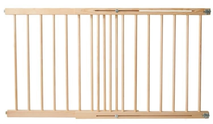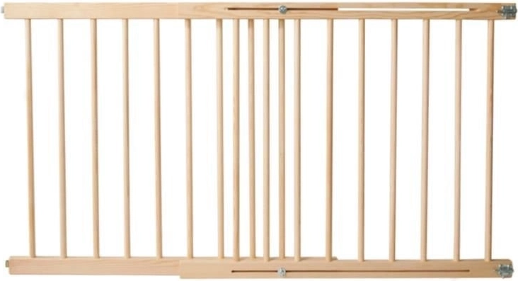 Bramka działa jako otwierane skrzydło – z jednej strony solidne zawiasy, z drugiej zasuwki przesuwne z podwójnym zabezpieczeniem. Mocne szczebelki (19 mm) zapewniają wytrzymałość i stabilność. Montaż jest łatwy i elastyczny: do ściany, ościeżnicy, drewnianych elementów lub poręczy. Odpowiednia dla dzieci i zwierząt domowych.