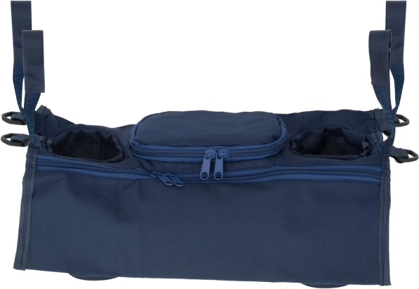 Utrzymuj porządek podczas spacerów z dzieckiem. Ten granatowy organizer do wózka oferuje przemyślany układ kieszeni i stabilne trzymanie napojów, aby wszystko było bezpiecznie i przejrzyście uporządkowane.