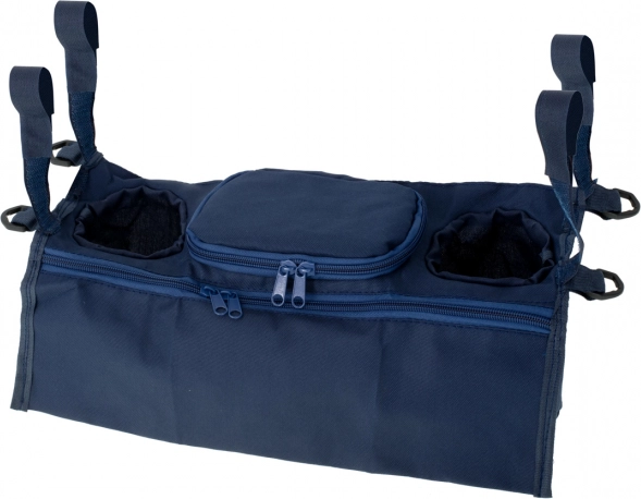 Praktyczny organizer do wózka z dwoma uchwytami na butelki, pojemną kieszenią na zamek oraz mniejszą kieszonką na zamek. Łatwo montowany za pomocą rzepów, utrzymuje wszystkie niezbędne rzeczy pod ręką – od pieluch i chusteczek po zabawki, telefon oraz butelkę z mlekiem lub napojem.