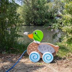 Ta klasyczna kaczuszka do ciągnięcia zaprasza dzieci do aktywnej zabawy i pierwszych spacerów. Dzięki stabilnym kółkom i płynnemu toczeniu łatwo prowadzi się ją za sznureczek, a skrzydełka podczas jazdy wesoło machają. Połączenie atrakcyjnych barw i przyjemnego, drewnianego wykończenia naturalnie wspiera ciekawość i samodzielny ruch.