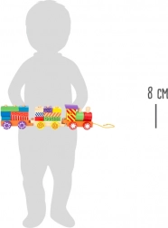 Zabawny pociąg do ciągnięcia dla najmłodszych rozwija motorykę, koordynację i wyobraźnię. Dzięki kolorowym drewnianym klockom można łatwo zmieniać wygląd lokomotywy i dwóch wagoników, które można połączyć i ciągnąć za sznurek. Wesołe kolory i wzory zachęcają do zabawy i nauki.
