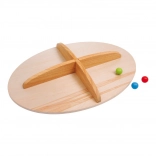 Deska balansowa jest wykonana z certyfikowanego, naturalnego drewna i oferuje ekologiczną i trwałą konstrukcję. Dzieci mogą stać na owalnej platformie i próbować balansować ciałem, prowadząc kolorową kulkę przez wyrzeźbiony labirynt. Ten angażujący sposób zabawy zachęca do rywalizacji i rozwija kluczowe umiejętności motoryczne.