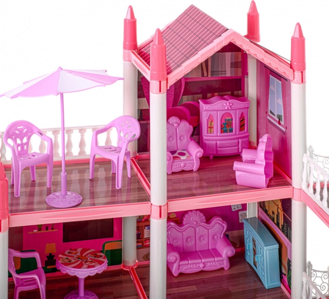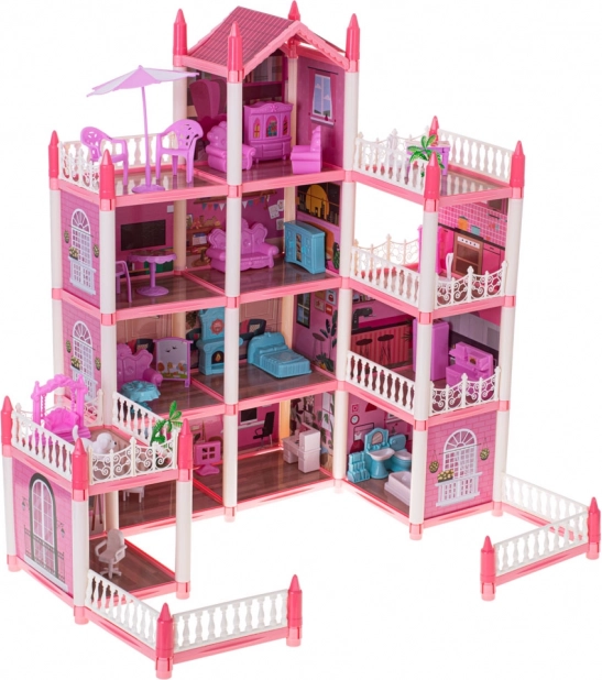 Różowa willa dla lalek ma cztery piętra, które oferują fascynujące i zróżnicowane pomieszczenia do odkrywania.