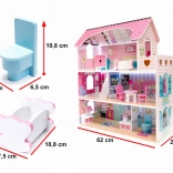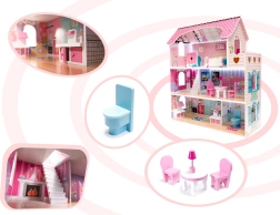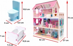 Duży drewniany domek dla lalek o wysokości 70 cm z MDF oferuje dzieciom trzy piętra, pięć pomieszczeń i taras, bogaty zestaw mebli oraz efektowne oświetlenie LED. Dzięki otwieranym szafkom, starannemu wykonaniu i bezpiecznie zaokrąglonym elementom to idealna zabawka do kreatywnej i udawanej zabawy, a także piękna dekoracja pokoju dziecięcego.