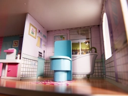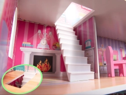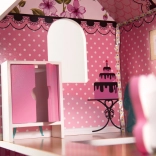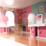 Domek oferuje trzy poziomy z pięcioma pomieszczeniami, schodami i balkonami. Kolorowe nadruki ścian i podłóg tworzą przytulną atmosferę do zabawy w wyobraźni.