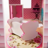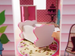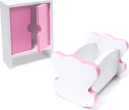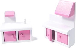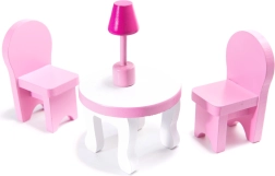 W zestawie 9 elementów wyposażenia: szafa, kołyska, lampa, 2 krzesła, stół, kuchnia z okapem, szafka ze zlewem i toaleta – gotowe do natychmiastowej zabawy.