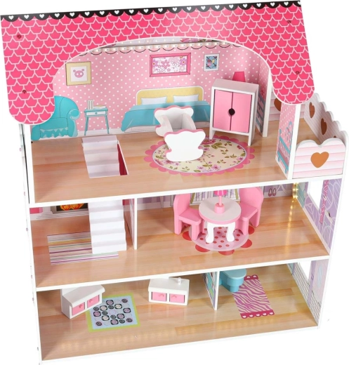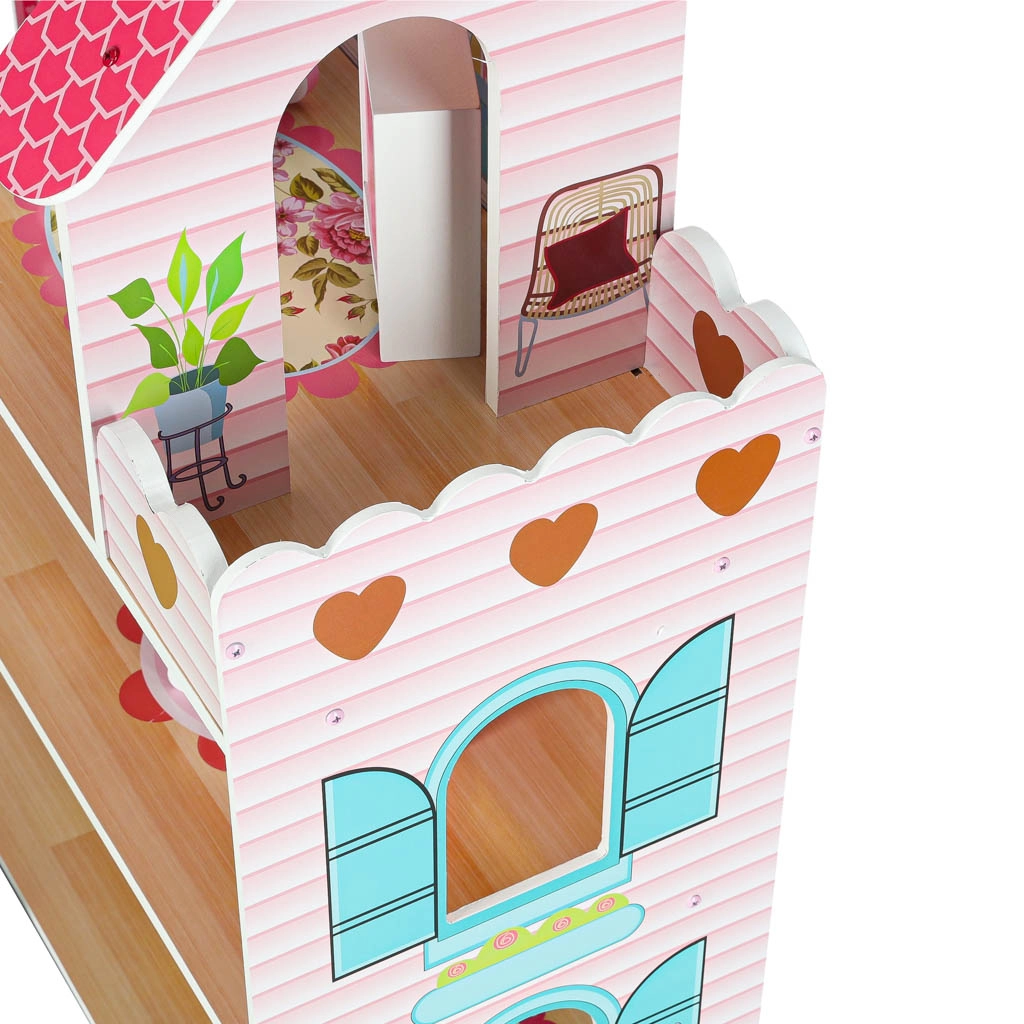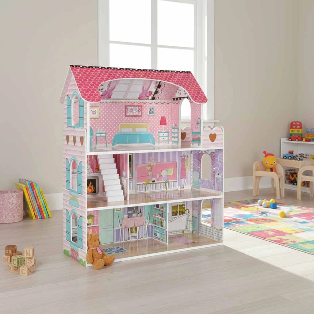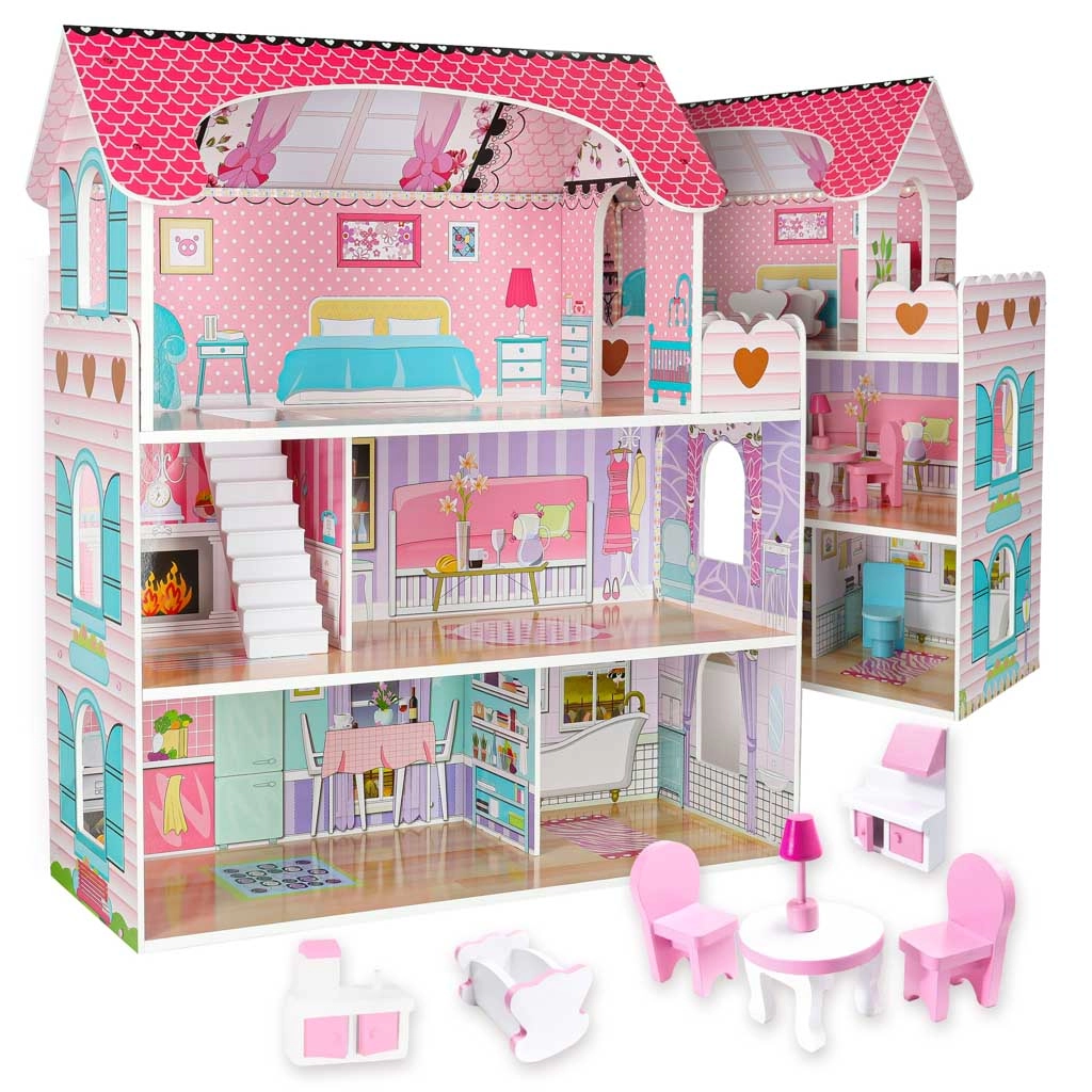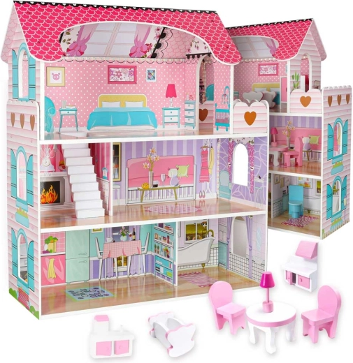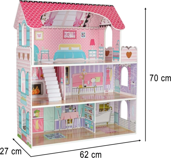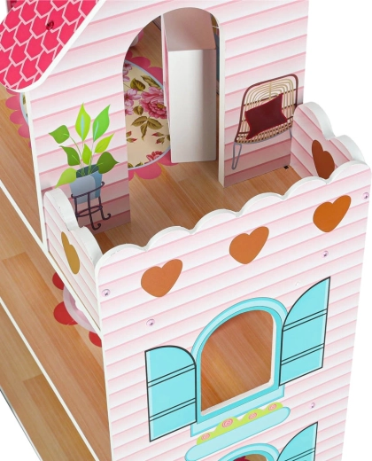 Duży drewniany domek dla lalek ucieszy dzieci i rodziców. Trzy przestronne piętra mieszczą kuchnię, łazienkę, sypialnię, salon oraz klatkę schodową z balkonem. Bogaty zestaw drewnianych akcesoriów i realistyczne nadruki ścian wspierają kreatywną zabawę w odgrywanie ról oraz rozwój motoryki małej.