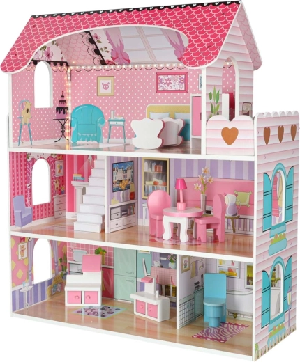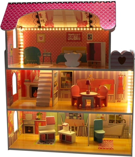 W zestawie znajduje się oświetlenie LED na samoprzylepnym pasku – łatwo umieścisz je na sufitach lub ścianach, tworząc przytulny klimat. Wszystkie elementy są gładko wykończone dla bezpiecznej zabawy. Domek jest także piękną ozdobą pokoju dziecięcego.