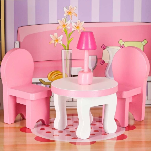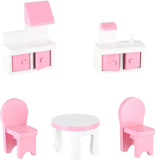 W komplecie szafki z otwieranymi drzwiczkami, aneks kuchenny, stół i krzesła, kołyska, lampa oraz toaleta – wszystko z gładko wykończonego drewna z delikatnymi detalami.