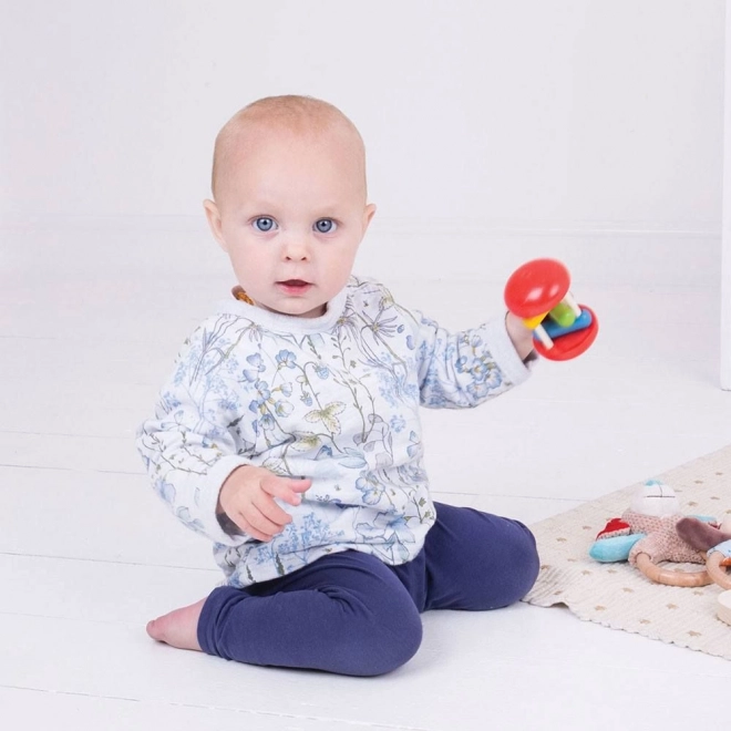 Tęczowy wałek Bigjigs Baby to ponadczasowa drewniana grzechotka, która zachwyca intensywnymi kolorami i przyjemnym dźwiękiem. Trzy kolorowe klocki podczas turlania lub potrząsania kołyszą się i delikatnie uderzają o podpory, zachęcając dziecko do dalszego odkrywania, chwytania i poruszania się.