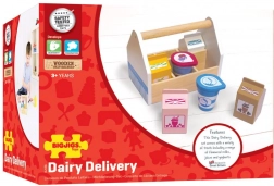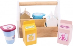 Ta solidna drewniana skrzynka kryje cztery kartony napojów (mleko, sok pomarańczowy, koktajl truskawkowy i czekoladowy) oraz kubeczek jogurtu i śmietanki. Idealny dodatek do dziecięcej kuchni i sklepiku, który w przystępny, zabawowy sposób przybliża dzieciom podstawy zdrowego żywienia i pochodzenie żywności.