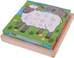 Klocki obrazkowe z motywami farmy ucieszą małych budowniczych i miłośników zwierząt. Z szesnastu solidnych drewnianych klocków dzieci stopniowo ułożą sześć różnych scen – wystarczy odpowiednio obracać poszczególne klocki i odnajdywać elementy, które do siebie pasują. Zabawa w atrakcyjny sposób wspiera koordynację oko–ręka, logiczne myślenie oraz cierpliwość.