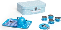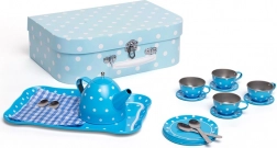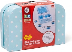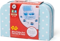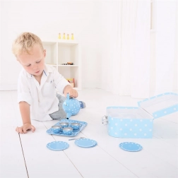 Uroczy zestaw do herbaty w białe kropki jest schowany w lekkiej tekturowej walizeczce, więc dzieci mogą zabrać go wszędzie – na wycieczkę, do dziadków czy na piknik. Metalowy czajniczek, filiżanki i spodki zapewniają trwałość, a taca do serwowania i łyżeczki dopełniają realistyczne wrażenia z zabawy.