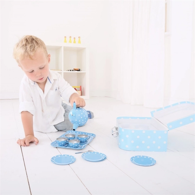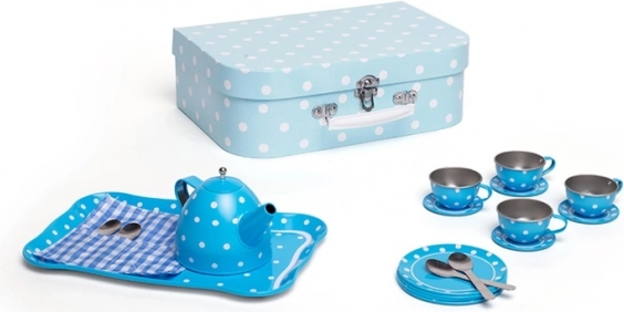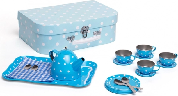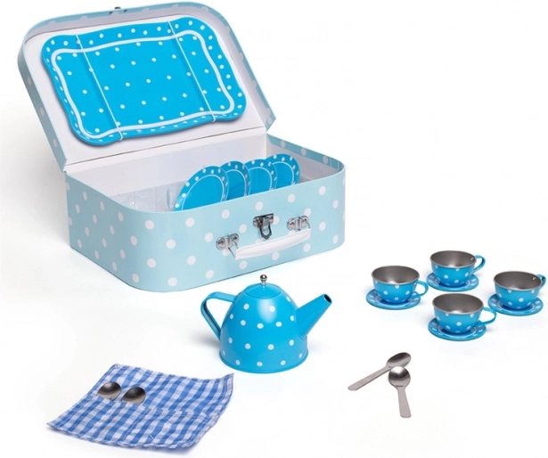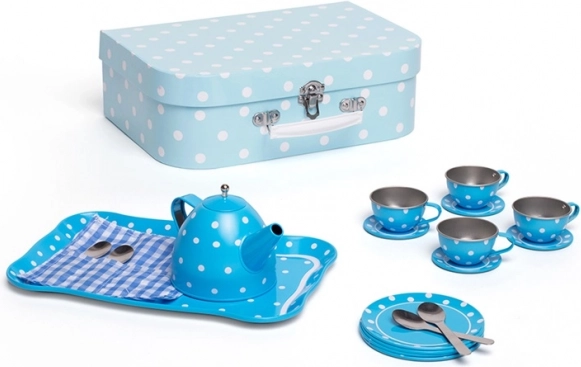 Stylowy niebieski zestaw do herbaty w białe kropki w solidnej walizeczce ucieszy każdego małego gospodarza. Zawiera wszystko do idealnych dziecięcych „herbatkowych spotkań” – od czajniczka po filiżanki i spodki. Dzięki metalowemu wykonaniu zestaw jest trwały, łatwy do przenoszenia i idealny w podróży. Zabawa wspiera kreatywność, wyobraźnię i umiejętności społeczne oraz spełnia europejskie normy bezpieczeństwa.