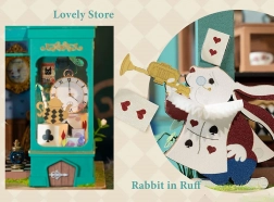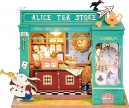Odkryj miniaturowy świat pełen fantazji – utrzymany w zieleni sklep z herbatą z motywami białego królika, kieszonkowego zegarka i szachownicowej podłogi tworzy atmosferę europejskiego popołudniowego podwieczorku. Po włączeniu oświetlenia LED model zamienia się w czarującą dekorację z przyjemnym wieczornym nastrojem.