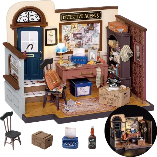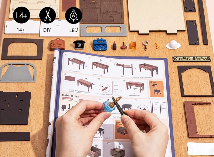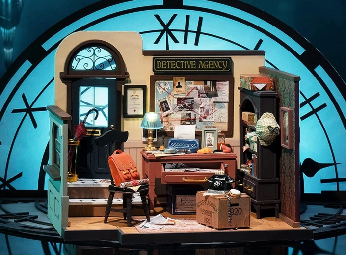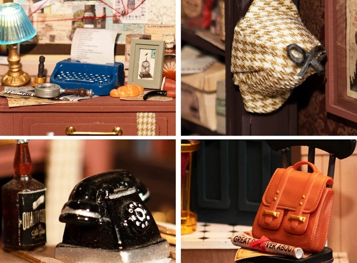 Odkryj urok klasycznej detektywki z nostalgicznymi elementami – od retro maszyny do pisania, przez telefon tarczowy, po tablicę ze śladami i ikoniczny detektywistyczny kapelusz. Każdy element złożysz własnymi rękami, a dzięki oświetleniu LED gotowy model tworzy nastrojową scenę także po zmroku.