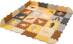 Maty można użyć jako dużej przestrzeni do zabawy 143 × 143 cm albo złożyć kojec 113 × 113 × 16 cm. Miękka pianka EVA amortyzuje uderzenia, izoluje od chłodu i nie ślizga się. Materiał jest łatwy w czyszczeniu – wystarczy przetrzeć wilgotną ściereczką. Elegancka, neutralna paleta współgra z nowoczesnym wnętrzem i może zastąpić dywan w pokoju dziecięcym.