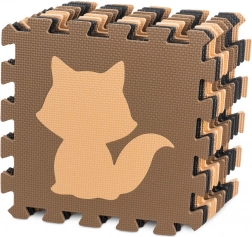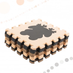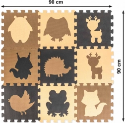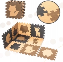 Miękka i bezpieczna mata dla dzieci z wytrzymałej pianki EVA w neutralnych odcieniach beżu i brązu. Zestaw 9 elementów z wyjmowanymi kształtami zwierząt tworzy powierzchnię 85 × 85 cm i umożliwia układanie także form 3D. Izoluje od chłodu, tłumi uderzenia, jest wodoodporna i łatwa w czyszczeniu. Idealna na pierwsze kroki, zabawę i naukę kształtów.