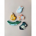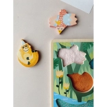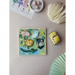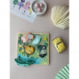 Projekt Michelle Carlslund w delikatnych pastelowych barwach nadaje zabawce atrakcyjny wygląd i pobudza wyobraźnię. Drewniana podstawa z wycięciami i motywami zwierząt uczy dzieci dopasowywać kształty, rozpoznawać kolory i zwierzęta. Puzzle są trwałe, bezpieczne i wykonane z wysokiej jakości drewna w połączeniu z tkaniną.