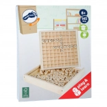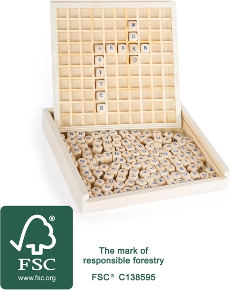 Ta drewniana gra jest doskonałą pomocą w rozwijaniu umiejętności językowych. Plansza do gry ma przygotowane okienka, w które można umieszczać kostki z literkami, co zapewnia ich pewne rozmieszczenie podczas gry.