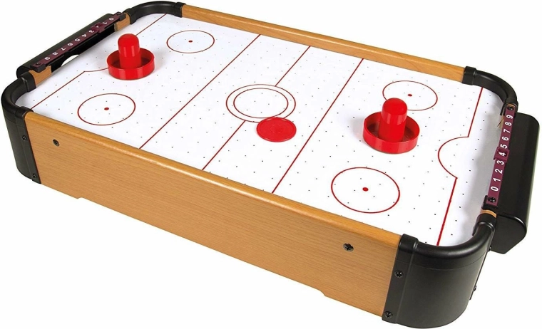 Stół ma solidną drewnianą ramę, zintegrowane bramki, manualne suwakowe liczniki punktów po obu stronach i jest dostarczany z dwoma popychaczami i krążkiem. Gra rozwija koncentrację, koordynację ręka–oko oraz fair play.