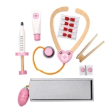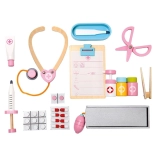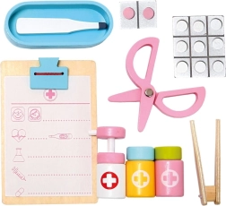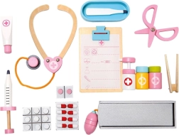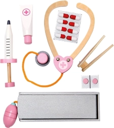 W zestawie znajdują się drewniane narzędzia takie jak stetoskop, strzykawka i inne akcesoria wspierające realistyczną zabawę.