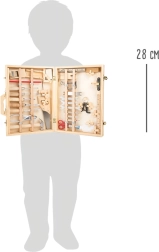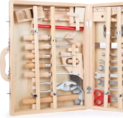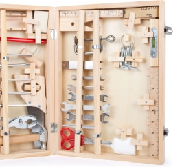Kompletny zestaw dla małych majsterkowiczów w eleganckim drewnianym kuferku. Zawiera 48 elementów drewnianych i metalowych narzędzi, takich jak klucze, śrubokręty, piła czy młotek. Każdy element ma swoje miejsce i jest zabezpieczony blokadami bezpieczeństwa dla przejrzystego i bezpiecznego przechowywania.