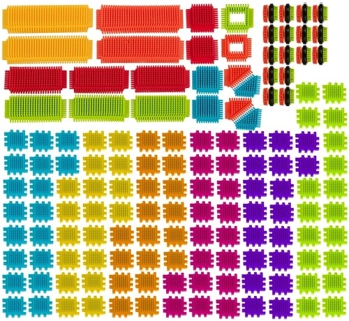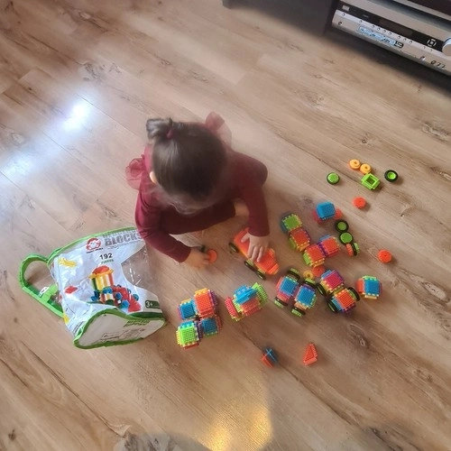 Ta barwna konstrukcyjna układanka z „jeżykową” fakturą pozwala dzieciom tworzyć nieskończoną liczbę budowli – od domków i pojazdów po bajkowe zamki. Elementy mają zaokrąglone końce dla bezpiecznej zabawy od 3. roku życia i łatwo się łączą oraz rozłączają.