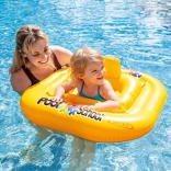 Zabawa i bezpieczeństwo dla twojego dziecka przy pierwszych krokach w wodzie z nadmuchiwanym kołem pływającym z siedzeniem marki Intex. Idealne na basen i plażę.