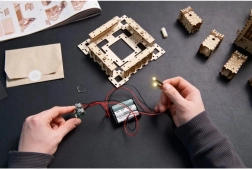 Zestaw zawiera 340 precyzyjnie wyciętych drewnianych elementów oraz szczegółową instrukcję. Z montażem poradzą sobie także bardziej uzdolnieni początkujący, a model zapewni dość wyzwań również zaawansowanym. Zasilanie można poprowadzić opcjonalnie przez USB‑C lub 3× AA (brak w opakowaniu), dzięki czemu łatwo wkomponujesz model w dowolną przestrzeń.