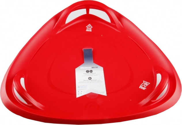 Talerz zjazdowy METEOR w czerwonym kolorze łączy prostotę i szybkość. Nowy trójkątny kształt poprawia stabilność i umożliwia wygodne siedzenie także dorosłym użytkownikom. Dzięki kompaktowym wymiarom łatwo go przenosić i jest gotowy, by w każdej chwili ruszyć na górkę.