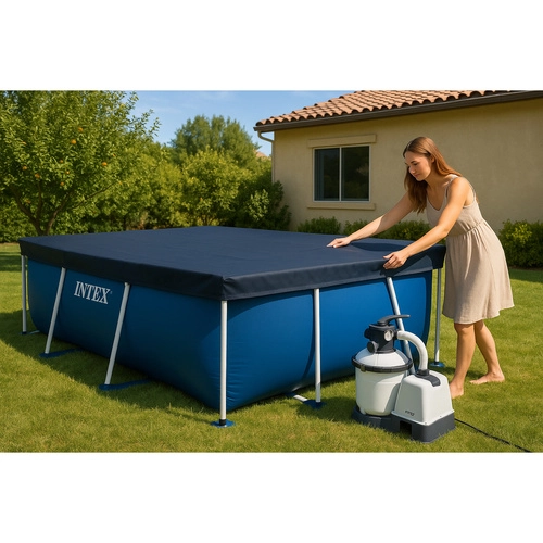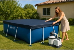 Pokrywa jest przeznaczona do prostokątnych basenów stelażowych INTEX 300 × 200 cm i ściśle przylega na całym obwodzie dla maksymalnego efektu.