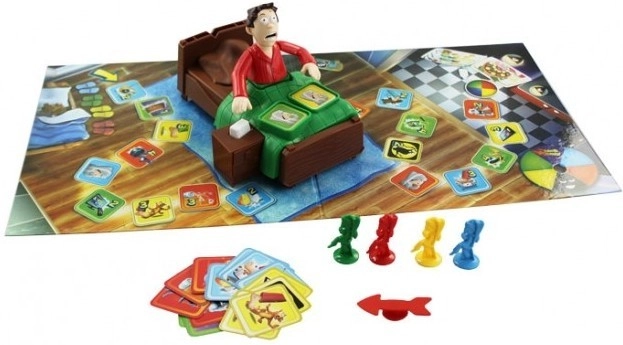 - Kompletny zestaw: tata w łóżku, plansza z ruletką, 16 kart z obrazkami.