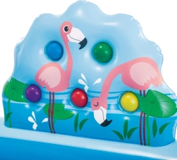 - basen, zjeżdżalnia, fontanna, flaming, małpka, hipcio, kółko (ringo), 5 piłeczek, łatka naprawcza, instrukcja, kolorowe opakowanie
