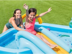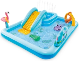Przemień ogród w wodny świat zabawy z centrum INTEX. Szeroka zjeżdżalnia z miękką podkładką zapewnia delikatne i bezpieczne lądowanie, a płytki brodzik i większy basen oferują orzeźwienie w upalne dni. Zintegrowana fontanna z regulacją przepływu wody nadaje zabawie nowy wymiar.
