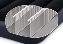 Materac łatwo się pompuje i spuszcza z niego powietrze, a po złożeniu zajmuje minimum miejsca. Dzięki przemyślanej wewnętrznej konstrukcji z podłużnymi komorami równomiernie rozkłada ciężar i gwarantuje stabilność przez całą noc.