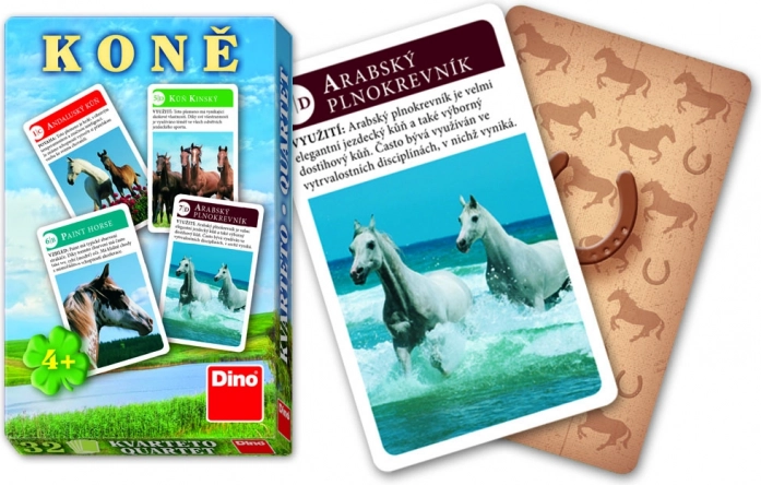 Kwartet Konie DINO – 32 ilustrowane karty o rasach koni. Zabawna gra rodzinna dla 3–6 graczy, proste zasady, czeska produkcja.