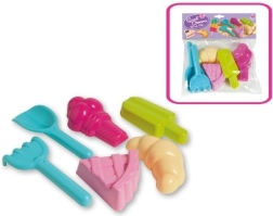 Zabawny zestaw do piasku dla małych cukierników. Dzięki tym foremkami dzieci stworzą torcik, loda na patyku, gałkowe lody i inne smakołyki. W zestawie znajdują się także łopatka i grabki dla łatwego formowania. Lekki plastik, prosta obsługa i mix kolorów gwarantują godziny twórczej zabawy na placu zabaw i na plaży.