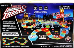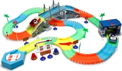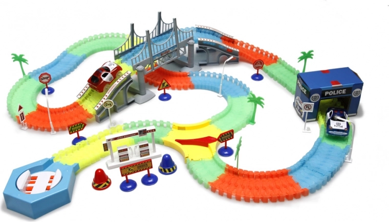 Świecący tor z 220 elastycznymi elementami zapewnia kreatywne budowanie i emocjonujące wyścigi także w ciemności. Elementy łatwo się ze sobą zatrzaskują, dzięki czemu stworzysz proste, zakręty oraz most/przeprawę, a całą trasę zmienisz w kilka chwil.