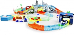 W zestawie znajduje się samochodzik LED (czerwony lub niebieski), który świeci podczas jazdy i pozostawia imponujący efekt świetlny. Scenerię uzupełniają posterunek policji, znaki i stacja benzynowa, co pozwala dzieciom rozwijać wyobraźnię i zabawę fabularną.