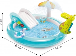 Przynieś swoim dzieciom radość z letniego dnia pełnego wody i zabawy z tym dmuchanym basenikiem dziecięcym marki INTEX. Wyposażony jest w zjeżdżalnię, okrąg zabawowy i fontannę w kształcie krokodyla, co zapewni nieskończoną zabawę przy wodnych grach.