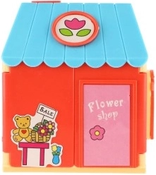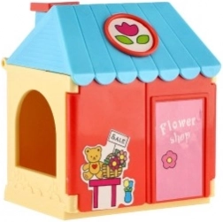 Wesoły domek z motywami kwiatów i kasą uczy dzieci łączenia kolorów, aranżowania oraz dbania o klientów.
