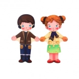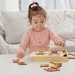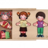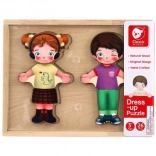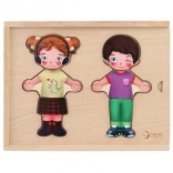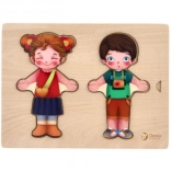 Drewniana deska z postaciami chłopca i dziewczynki pomaga rozwijać małą motorykę i logiczne myślenie.